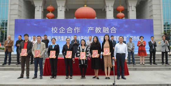 下午2时53分,丽汽集团常务副总经理何赤诠与丽水职业技术学院党委副书记杨云峰签订“丽汽集团奖教学金”设立协议。