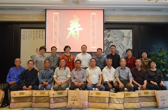 左边是“福如东海”写满衷心祝福,右边为“寿比南山”送上美好祝愿,遒劲的“寿”正居中央。 5月4日,丽汽集团党政工领导齐聚一堂,在莲城宾馆为70岁、80岁和90岁及以上老同志集体祝寿。