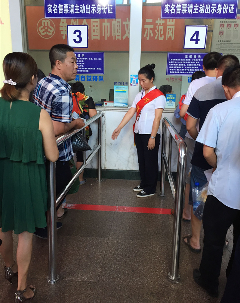 “您好!请不要越过红线,请站在一米线后等待,”售票厅里尤丽娟正耐心地对正在排队买票的旅客进行劝导。