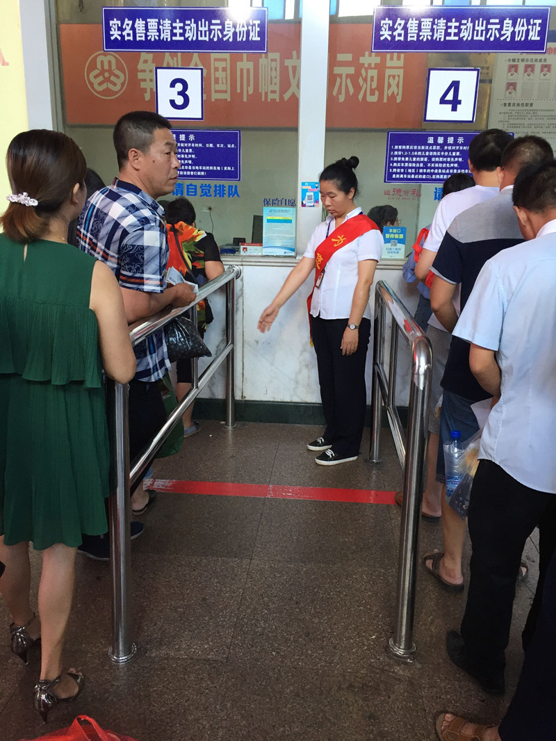 自从全国文明城市创建工作对一米线提出要求开始,东站售票厅一米线前的文明劝导工作就落在了站售组的组员身上。