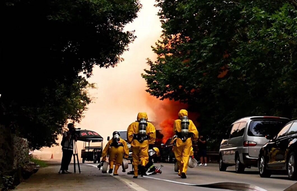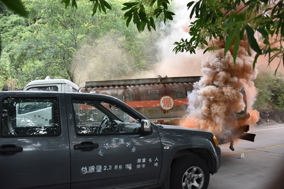 这是在2018年度丽水市道路运输突发事件应急处置演练现场发生的“惊险”一幕。