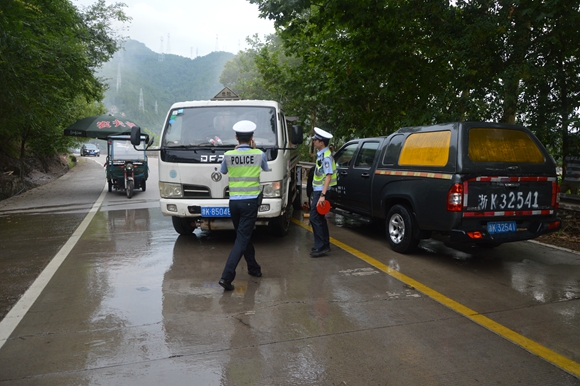 交警在危险地段拉起警戒线