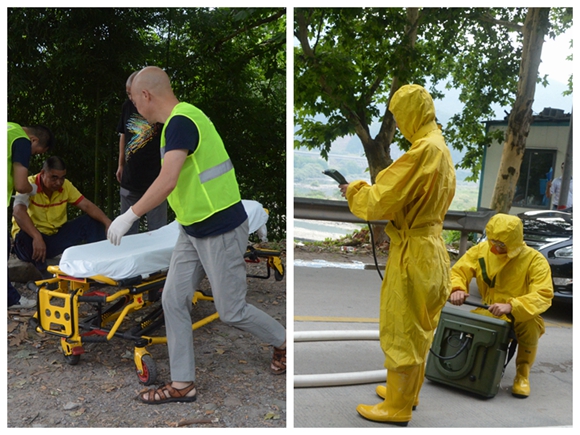 120赶到救治伤员、环保监测人员进行现场监测