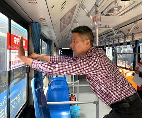 集团公司副总经理林周颖参加了公益活动,并为公交车张贴“守护员专座”标志。