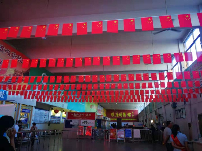 今年是中华人民共和国成立70周年,为团结动员广大党员干部和员工以极大热情投身到车站的工作中,客运东站在候车厅、站场以悬挂国旗为主导,配合彩旗和灯笼、鲜花,营造庄严肃穆的国庆氛围,让出行的旅客感受到浓厚的节日气氛。