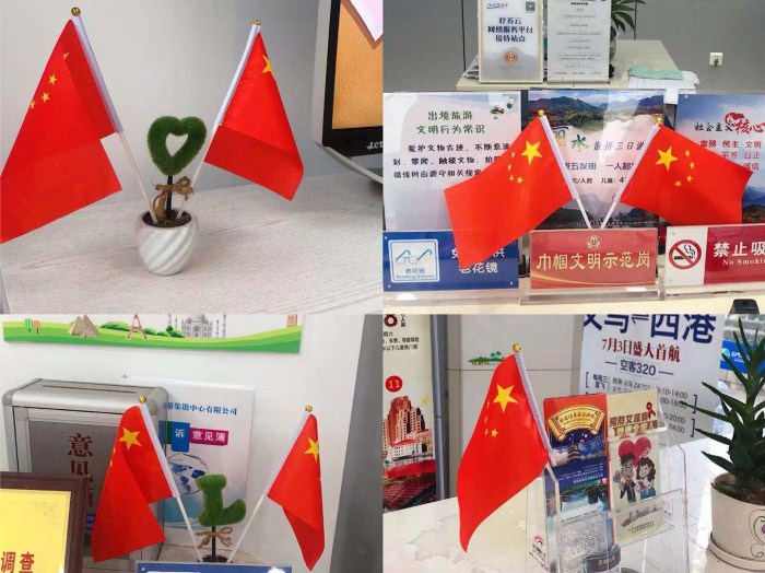 “十一”佳节临近,旅游集散门市中心为营造节日喜庆气氛,换灯笼、贴窗花,在门市大厅插上国旗。同时召开部门工作会议,对“国庆”安全生产、维稳安保工作进行了具体的分工部署。