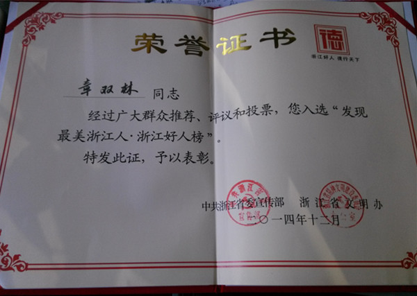 “发现最美浙江人--浙江好人榜”推荐评选活动由省委宣传部、省文明办联合开展,每月推荐评选一次,旨在为大力培育和弘扬社会主义核心价值观,积极普及和践行当代浙江人共同价值观,进一步深化“发现‘最美浙江人’、争做‘最美浙江人’”主题宣传实践活动,健全和完善“浙江好人”选树和培育机制,推动“最美”从“盆景”变成“风景”、从“风景”变为“风尚”。推荐评选分为助人为乐类、见义勇为类、诚实守信类、敬业奉献类和孝老爱亲类五个类别。评选活动经过网络投票、群众评议、专家评审等环节,12月份共评选出25名浙江好人,章双林入选见义勇为类浙江好人。