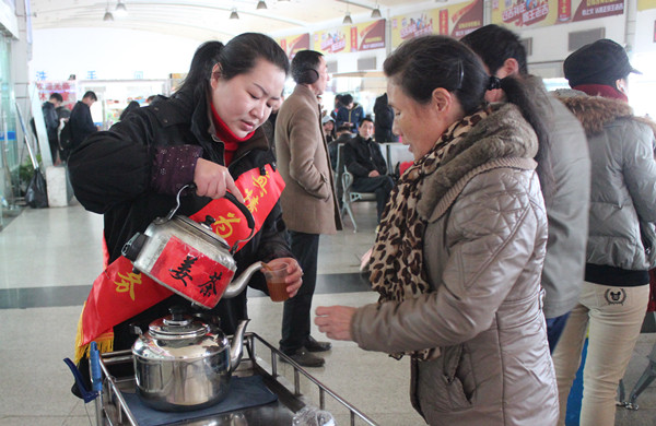 2月6日一大早,客运西站“流动之家”服务班的姐们早早就准备好一大壶热腾腾的姜茶,免费送到候车的旅客手上,希望热腾腾的姜茶能驱散早晚的寒意,让旅客回家的旅程变的更加温暖。