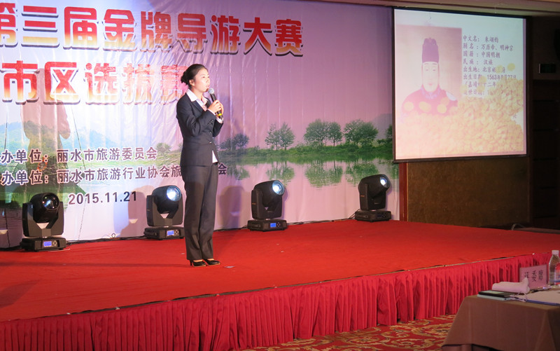 11月21日,丽水市第三届金牌导游大赛市区选拔赛在丽水市莲城宾馆隆重举行,19名参赛选手分别来自丽水市直10家旅行社,通过风采展示、景点讲解、才艺表演三大环节的比拼,旅游集散中心导游在参赛选手中脱颖而出:朱勇华总分排名第一,喜获一等奖;陈岳丽、马秀秀获得二等奖。