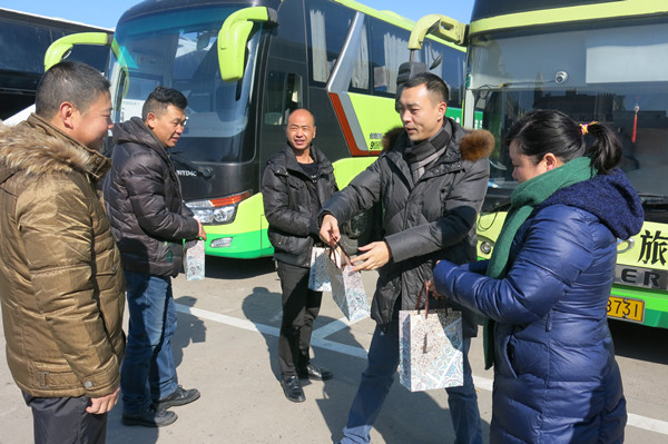 2016年1月25日上午,旅游集散中心经理翁伟邦、副经理薛虹及车队队长王华南一行前往汽车东站,给在东站参加长途加班运输工作的驾驶员送去节前问候和慰问品。慰问中一再叮嘱驾驶员要注意安全,在驾车时必须控制好车速,做好保暖工作,搭班驾驶员互相照应,不疲劳驾驶,注意自身健康。