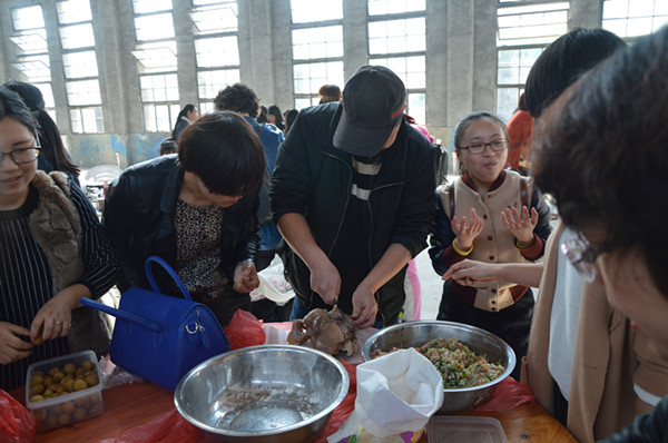 这边包饺子的问题正讨论的激烈,那边热气腾腾的猪头也出锅了。“呀,这么大的猪头,小时候过年的感觉”。“对啊,对啊,这种气氛,这种味道,太有纪念意义了”。“来来来,我拍张照片,微信朋友圈晒一晒”。黄色饺子、绿色饺子、红色饺子、紫色饺子相继的出锅了,烧烤的食品也相继出炉,大家互相品评,因为都是自己动手参与,一切都变成了美食。