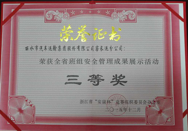 近日,浙江省“安康杯”竞赛组织委员会发布“2015年全省班组安全管理成果展示活动评选结果的通报”,市总工会推荐报送的“丽汽集团长运分公司班组安全管理成果展示”获三等奖。