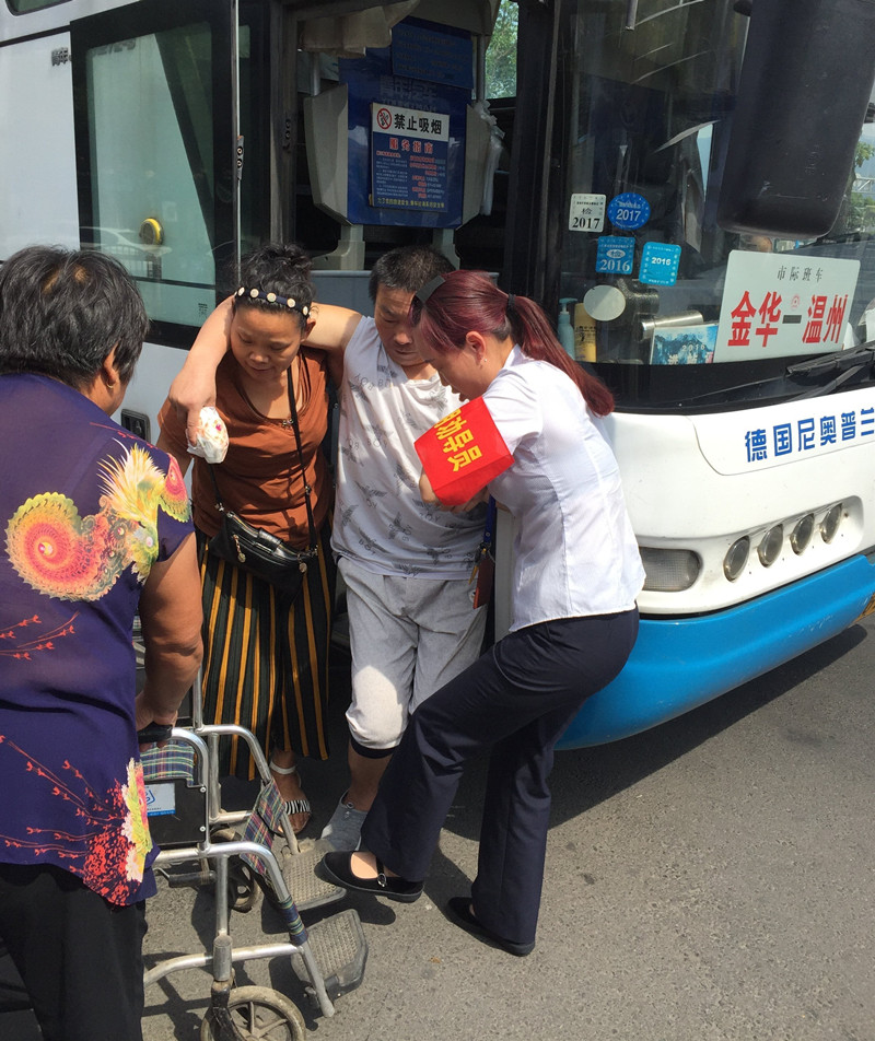 9:35金华到丽水的班车缓缓地驶进了高铁配载点。车一停稳,旅客们便陆陆续续的下车前往下一个目的地。眼尖的江旭红看见一位中年妇女在车门处很吃力的拉着什么,江旭红心想,车上可能有行动不便的旅客需要下车。江旭红全然不顾烈日的暴晒,毫不犹豫的迎上前去。果不其然,车门处的阿姨和车上的另一个阿姨正连拉带抱的帮一位行动不便的大叔下车。大叔看上去50多岁的样子,因为得了某种疾病一点都不会做自主的动作,全凭两位阿姨慢慢地挪动,160多斤的体重给两位阿姨扶他下车增加了不少的难度。才移下一个台阶,汗珠已经顺着两位阿姨的脸颊往下淌。江旭红立即从行李仓拿出他们随车携带的轮椅撑开,放在车门旁。由于车子台阶处较窄,站不下其他的人,江旭红就在车下位置帮着把大叔的脚抬起来,待大叔被移到最后一级台阶时,江旭红顺势托起大叔的一只手,和车上那位阿姨一起,使尽浑身力气一步一步慢慢地把大叔架到了轮椅上。接着江旭红又把大叔送到阴凉处,等待家人来接。这时的江旭红已是满头大汗,背上的衣服都湿透了。