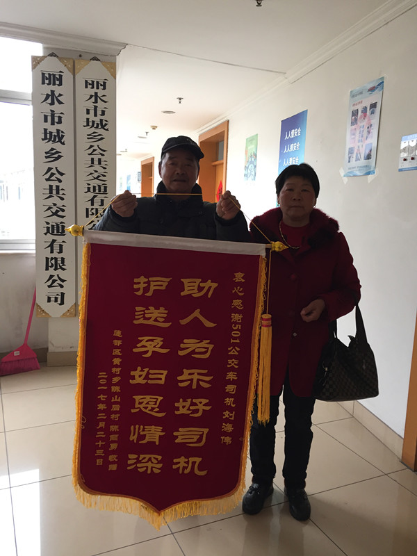 2月23日,丽水市城乡公交公司的办公室来了一对朴实的夫妇,他们拿着一面印有“护送孕妇恩情深,助人为乐好司机”字样的锦旗,指明要送给501路公交车司机刘海伟:“多亏了刘师傅帮忙,我儿媳妇才平安生下了大胖小子!”