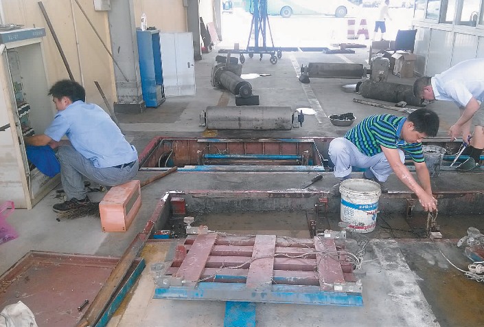 修理车间是客长运分公司的重灾区,洪水过后留下垃圾、淤泥一大片;8 条地沟全泡在污水里,其中一条自动检测线因长时间受洪水浸泡,受损严重。车间负责人快速找来电泵,先把地沟里的水抽去。为尽快恢复灾后生产,保证车辆安全运行,客长运分公司专门成立了抢修门检线应急小组,由王斌副经理负责; 检测站派出金军辉和金晓东两位技术人员帮忙抢修; 集团公司生产经营部经理江少华也在做技术指导。大家不间断工作十余小时,终于在晚上 7:00 左右,手工检测线抢修完毕,恢复正常工作。