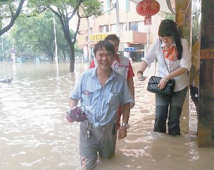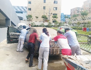洪水突袭市区后,售后接待电话就接连不断,传来的都是客户急切救援的声音。为更快速的开展救援工作,20日下午,夏伟强经理亲自带领施救组在一线实地指挥抢险救灾;经理助理金虹则带领销售团队分组分头沿着水路挨家挨户上门咨询、了解车辆受灾情况,以便施救车辆更快的实施施救工作;经理助理吕佩军在现场与售后师傅们现场转移车辆,推、拉、移所有的招式都用上了。浑浊的污水都没过了大腿,他们都无所畏忌。
