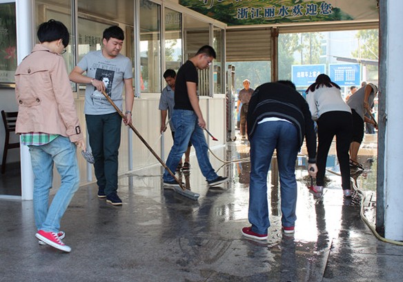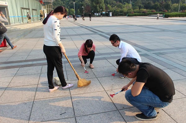铲刀、清洁刷、扫把、水管……清洁工具一一分配到手中之后,大家便热火朝天的干起来。虽已入秋,但午后的太阳依然刺眼,没一会儿,大家都开始冒汗,但谁也没停下手中的劳动,依旧顶着太阳蹲在地上铲口香糖或是奋力地洗刷地面。