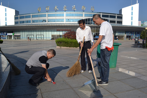 10月23日下午,快客分公司党员在党支部书记詹慧文同志的带领下,会同客运西站全体党员,开展创卫迎检志愿义务劳动,进一步清理站前广场的绿化带、车站周围的卫生死角,此项活动是西站片区党员创卫冲刺迎大考活动之一。