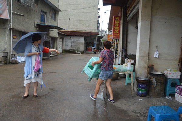 在一家早餐店门口,餐桌摆到了行车道上,吕主席上去劝导,老板立即把凳子搬到室内