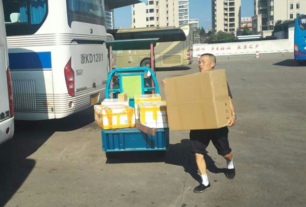 8月8日下午两点,今天的天气预报最高温度是36℃,可是室外温度依然高的可怕。东站行李房外,一辆永康班车迎面驶来,54岁的装卸工胡瑞华立刻推着手推车迎了上去。车停稳后,车上旅客纷纷下车跑向阴凉处,。对大部分人来说,这种太阳下面站着都吃不消更别说干活了。可是,胡瑞华在太阳底下一件又一件地卸货,认真干好本职工作没有一丝怨言。今天货有点多,卸了满满一车,好在胡瑞华技术娴熟,不一会儿就卸完了,推着车走进行李房。虽说只有几分钟的功夫,但胡瑞华已是满头大汗。车推进行李房后,他对着电扇吹了几下又接着开始安检理货入库的工作了。