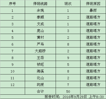 受台风“鲇鱼”影响,部分地方暴雨、道路塌方,为保护乘客的生命财产安全,9月29日,丽水客运东停开50个班次,详见下表: