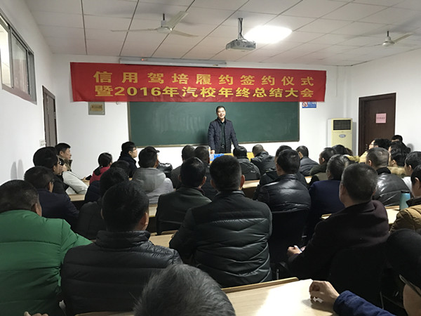12月30日,汽车技术学校在学校第一教室召开了“信用驾培履约签约仪式暨2016年汽校年终总结大会”。会上卢小平校长就2016年工作情况进行了总结汇报,并对2017年的工作进行了布置。卢小平校长要求坚持“把准改革脉动,转变思想观念,推进转型升级,提升服务水平,明确任务方向”指导思想,在僧多粥少,狼多肉少的形式下,对服务模式和教学方式进行改革,以新大纲、新合同、新评价为任务,最终完成“做精品驾培机构,创国优驾校”的目标。