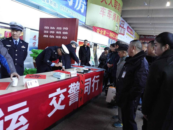 今天丽水市高速交警同志也给旅客带来可惊喜,他们挥动手中的毛笔为旅客写下一幅幅承载着吉祥、平安的春联,旅客们拿着春联露出幸福的笑容,为春运添上了一抹光彩。