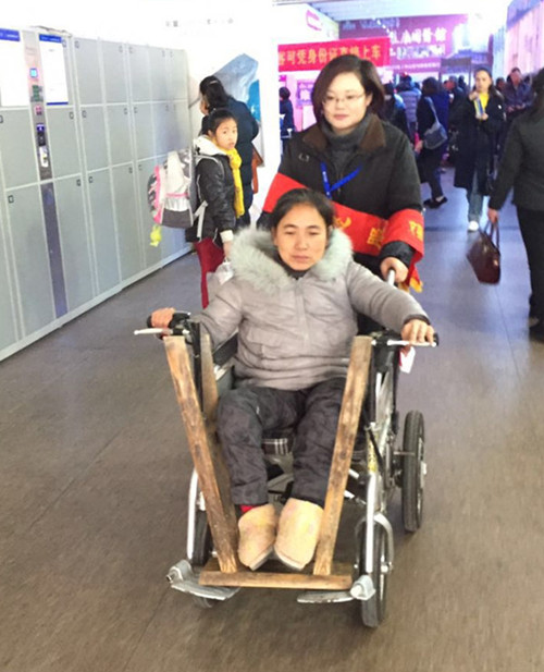 一位双下肢残疾的中年女性乘客,坐着轮椅在客运东站排队买票,这一路的行程原本会有些许麻烦,但好在有一名热心工作人员的帮助,她的旅途多了一份轻松和暖意。