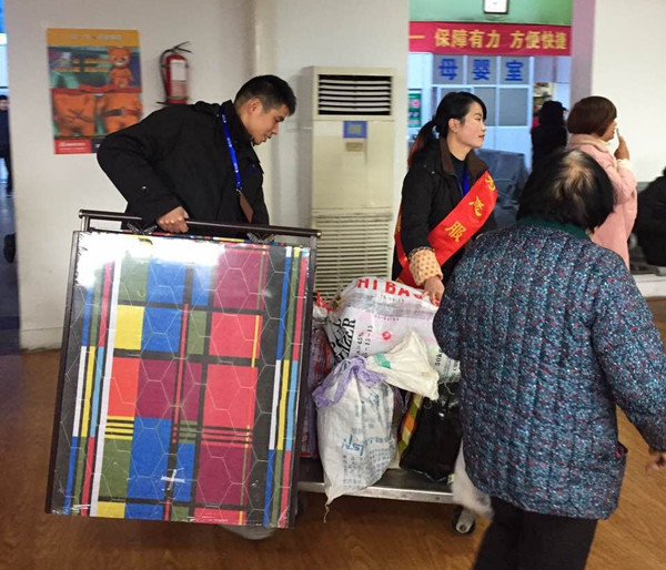 2月28日上午9点多,东站售票厅里一位70多岁的大妈正吃力地拖着一袋满满的东西往危检仪挪动。正在服务台上班的刘虹看见了,赶紧推着“流动之家”服务小推车上前帮忙。当刘虹帮着大妈一起把那一大袋物品放上小推车后,大妈吞吞吐吐地说道“姑娘,在外面门口我还有几袋东西,我的班车时间又快到了,你看能不能帮忙把我那几袋一起推进去啊?”看着大妈求助的眼神,深知旅客出门不易的刘虹没有犹豫,问了声“东西在哪里”后就随着大妈来到东站南大门口。