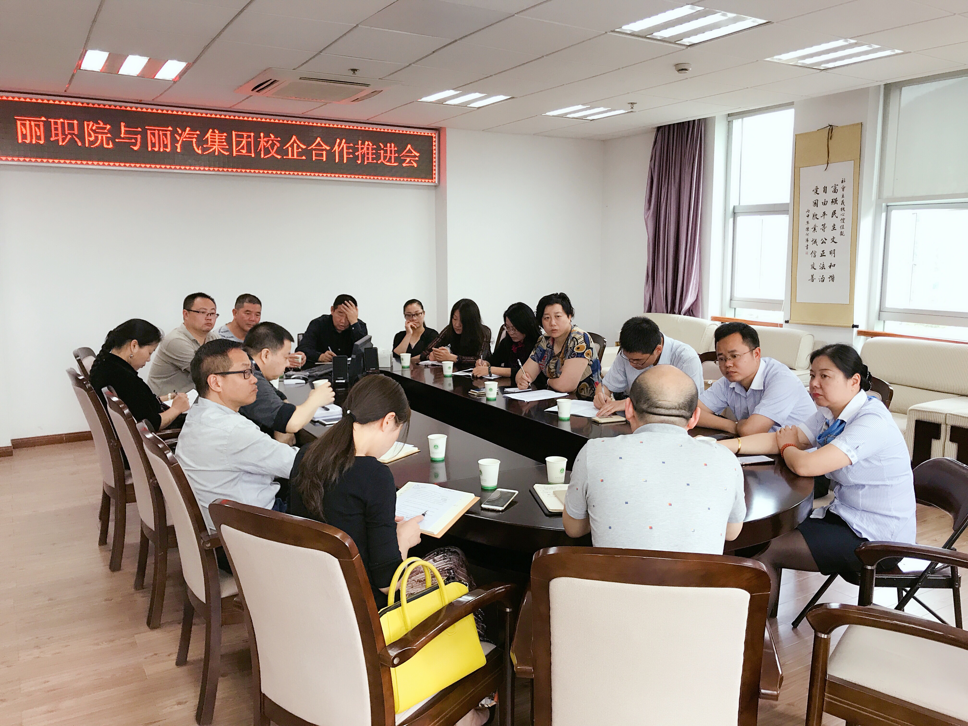 5月17日上午,丽汽集团与丽水职业技术学院“校企合作”推进会在校方行政楼召开。丽汽集团及汽校、旅游集散中心、4s店、文化传媒、多啦衣梦体验店等单位主要负责人和学院相关专业的老师齐坐一堂,共谋发展。