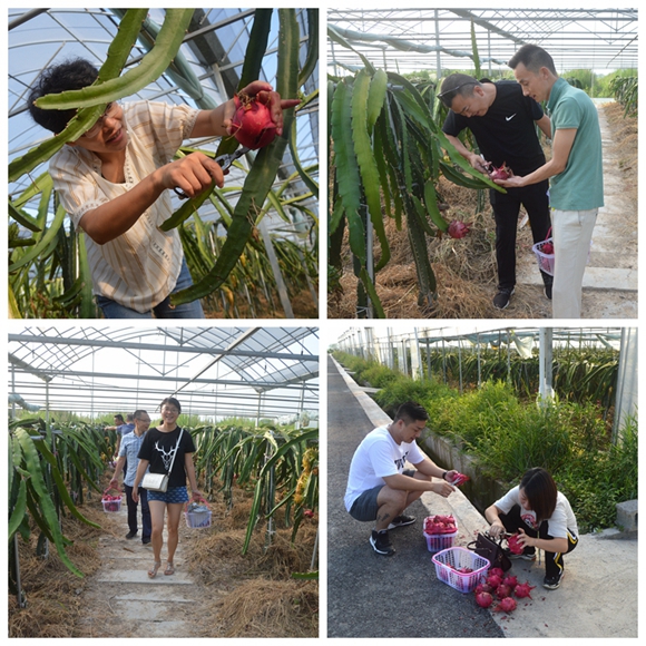 在缸窑村火龙果采摘基地,工作人员向大家介绍了基地火龙果的无公害种植模式和火龙果果肉、果皮以及花朵的食用价值。工会主席(组长)们也亲自体验了一把火龙果的采摘。看着枝头红艳诱人的果实,大家脸上挂满了的丰收喜悦。