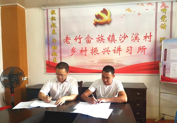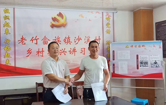 丽汽集团党委书记、董事长叶茂和沙溪村党支部书记蓝红星分别代表丽汽集团和沙溪村签署“村企合作”协议。