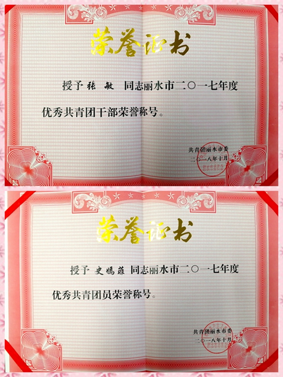 近日,为表彰先进,树立典型,共青团丽水市委表彰了一批先进集体和先进个人,其中,集团公司团委推荐的瓯龙(瓯翔)团支部书记张敏荣获“优秀团干”荣誉称号、集散中心团支部的团员史嫣菲荣获“优秀团员”荣誉称号。