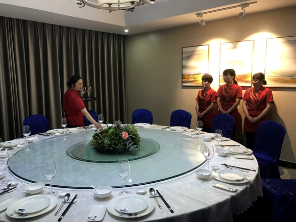 走近比武大赛现场,参赛的选手身着整齐的工作服,个个精神饱满。前厅服务组们有序站立、面带微笑,手持托盘,铺台布、放转盘、摆碗筷、大圆桌被装扮后显得格外精致。