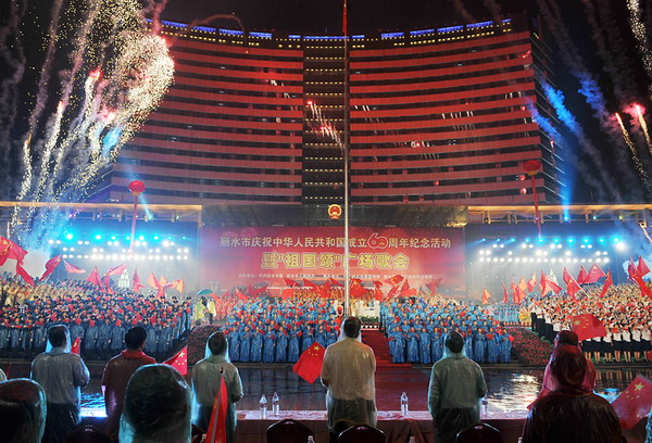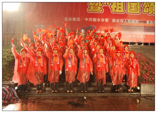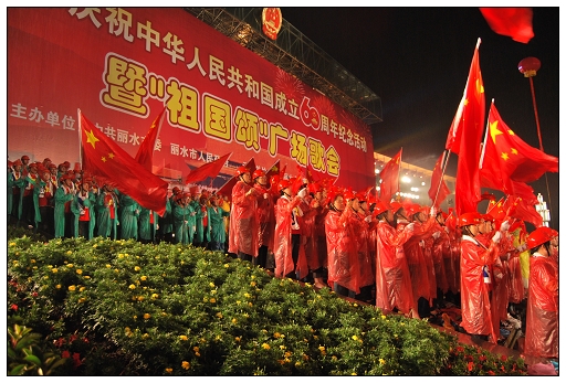 丽水市庆祝新中国成立60周年纪念活动暨“祖国颂”广场歌会隆重举行。歌会分革命英雄赞、建设新中国、走进新时代三个篇章进行。15个方阵依次进行大合唱,每个方阵各唱一首歌。