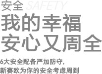 安全安全笼式车身、井字钢梁、溃缩空间设计 4轮29次安全碰撞测试,以国际安全标准呵护您的旅程 ABS+EBD、五座标准安全带(前排带预张紧功能) 全系标配双安全气囊、安全碰撞可溃缩吸能转向柱 后排车门儿童安全锁和后排IS0FIX儿童安全座椅固定装置 行人保护安全车头双翼区