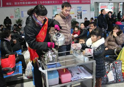 2月8日冷空气来袭,雨夹雪,一大早西站“流动之家”服务班的姐们就准备好一大壶热气腾腾的姜茶,并将一杯杯热气腾腾的姜茶送给返乡旅客,在帮助他们抵御严寒的同时使他们从内心感受到“家”的温暖与关爱。
