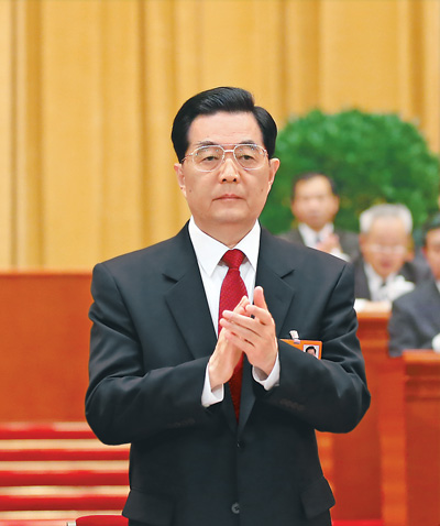 习近平表示,胡锦涛同志担任国家主席10年间,以丰富的政治智慧、高超的领导才能、勤勉的工作精神,为坚持和发展中国特色社会主义建立了卓越的功勋,赢得了全国各族人民衷心爱戴和国际社会普遍赞誉。在习近平的提议下,全场以热烈掌声,向胡锦涛表示衷心的感谢和崇高的敬意。