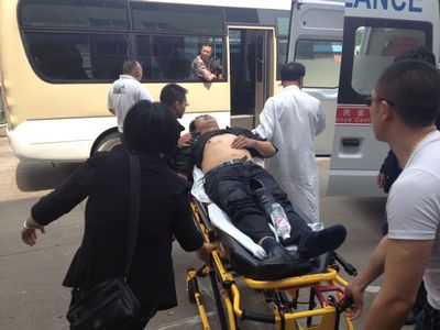 此时120急救车也赶到,通过医生现场诊断确为中暑,大家就一起把病人抬上了急救车,由于大家的及时救助,为救治争取了时间,否则后果很难想像。