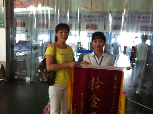 7月20日上午,客运西站值班室迎来一位特殊的客人。她执意要找到客运西站行车员胡坚芬,将一面写着“拾金不昧”的锦旗和一个水果篮交到胡坚芬手中,并再三表达了对胡坚芬的谢意。