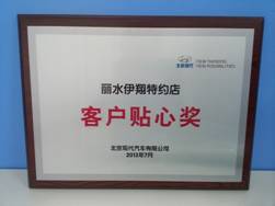 近年来,伊翔公司在主抓生产的同时,讲实效、重管理,不断完善企业内部管理制度,服务质量日趋提升。日前,从北京现代公司总部传来喜讯:丽水市伊翔汽车销售服务有限公司荣获北京现代汽车有限公司颁发的“客户贴心奖”和“M/S进步奖”,王明敬获北京现代2012年度“优秀销售顾问”称号。