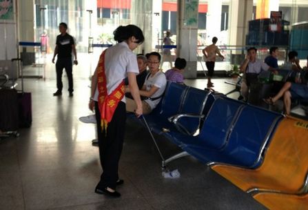 踏进站前广场,你会看见保洁员拿着扫把、簸箕不停的巡视,及时的清理;买票时,你会时不时看见保卫稽查人员拿着长柄镊子在清理;候车时,推着服务车的西站服务班工作人员在为旅客提供服务的同时也拿着长柄镊子清理地上的垃圾;上车时,你还会在发车区看见检票员跟调度员在发车间隙拿着长柄镊子及时清理正在上车的旅客丢下的垃圾。不远处的场地上,是拿着镊子和垃圾袋的值班站长的身影。