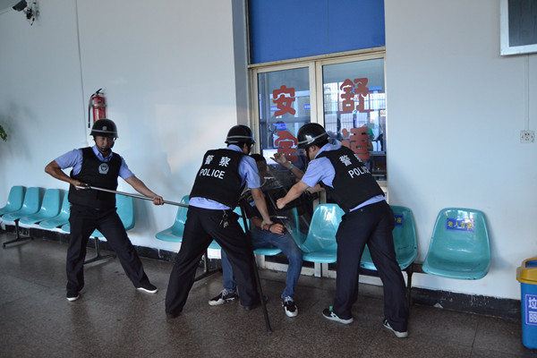 (科目二:反恐演练)一名青年男子在过安检时被查出包内携带一把管制刀具,安检员上前检查时该男子拒绝配合,同时挥舞起刀具往候车大厅逃跑。业务站值班人员立刻通过广播通知旅客不要慌张,同时疏散遭受惊吓的旅客。保卫科立即报警,并向值班科长汇报,保卫科反恐应急人员携带反恐器材火速赶到现场,大声呼喝让其放下刀具,一面盾牌迎面顶上,该男子被逼到墙角,另一位队员用钢叉迅速将目标固定,趁其慌乱之际,防暴棍准确的砸在男子手腕上,凶器应声掉落,另一名队员一脚踢开刀具,三人合力,将凶徒控制住,扭送给赶到的公安民警。