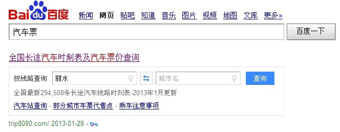畅途网是由特捷交通技术系统有限公司开发运营的大型网上售票网站,网址为www.trip8080.com。畅途网通过与百度、搜狗、搜搜、360搜索等多家搜索引擎网站合作,旅客只要在相应的搜索引擎中搜索“汽车票”,就可查询到丽水东、西两站的班次信息。畅途网后续还将与淘宝、腾讯等其他电商合作,扩展汽车票的销售渠道。目前已并网售票的客运站有300多家,还有200多家已签约正在开通中。丽汽集团售票系统自今年7月24日并入畅途网后,已出售东、西两站客票1500多张。