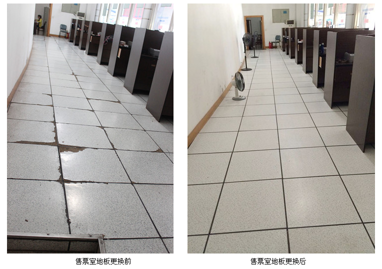 客运西站主楼一层售票室和消防监控室的防静电地板因使用多年,破损严重,影响了西站整体的美观。为了保持西站良好的窗口形象和符合创建国家卫生城市的要求,近日,西站对售票室和消防监控室的防静电地板进行更新。