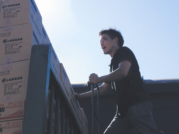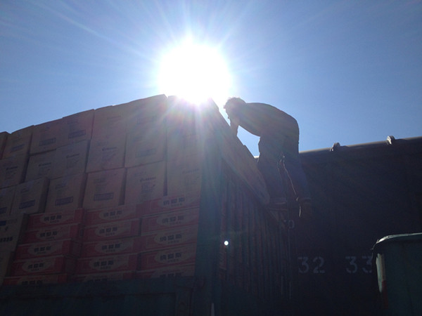 7月29日14:05,南明物流货运驾驶员高丽平在烈日下忙碌地装卸货物