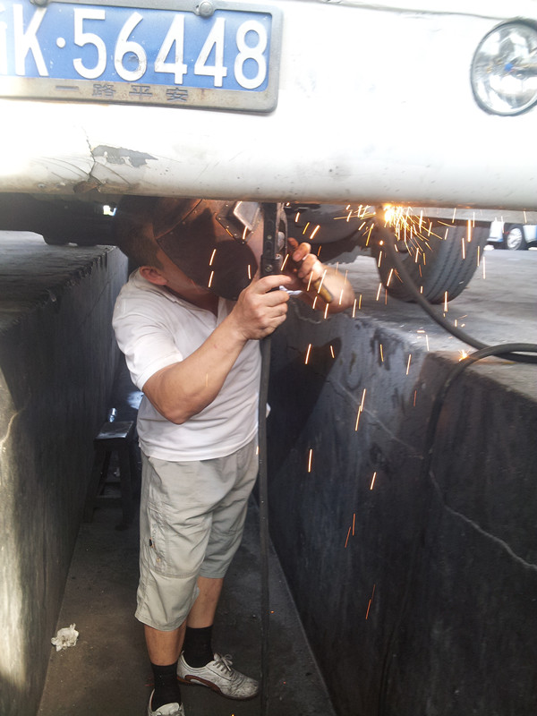 客长运分公司修理工陈勇军师傅正在进行电焊作业,灼眼的火星、浅蓝的焊雾、呛鼻的气味弥漫维修车间