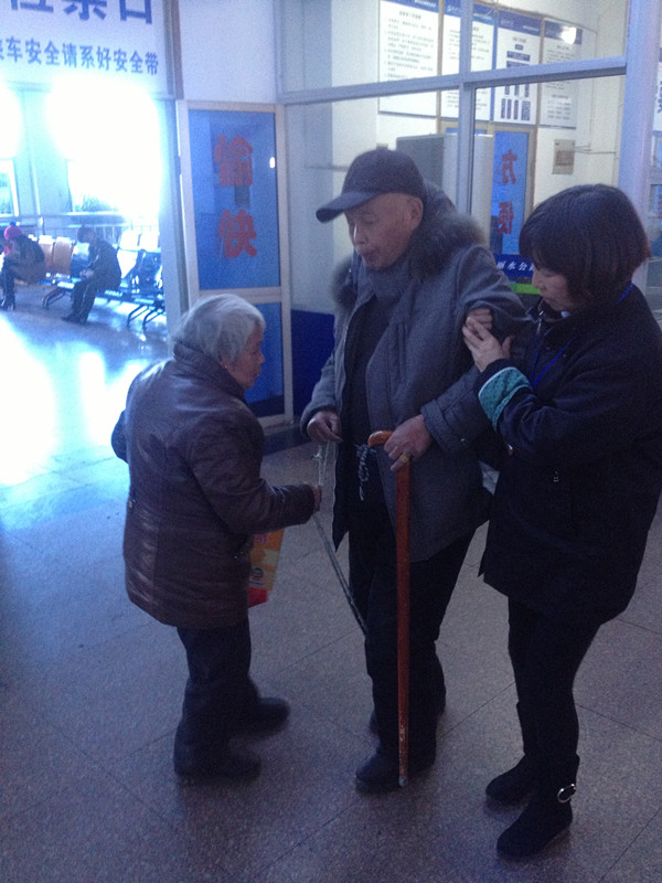 蔡美娟搀扶着老大爷,他老伴拉着绳子,走一步提一下大爷的右脚缓慢的行走着。就这样,蔡美娟扶着老大爷走几步,就要稍停一下,等老大爷喘下气再继续走。由于13号检票口位于东站候车厅的最里面,从售票厅走过去还是有100多米的样子。一路上老大爷不停的问到了没有,蔡美娟感觉到老大爷虽然有她扶着可还是有点吃不消了,就不断的鼓励老大爷:“再坚持一下,我们就要到了!”就这样,短短的100多米,他们三个人却艰难的走了五六分钟。(相关视频已经上传在群空间)
