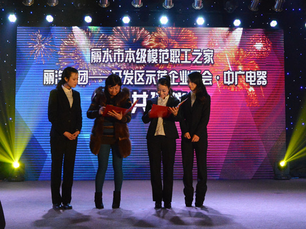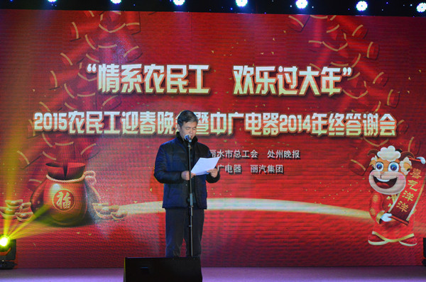1月31日晚,由丽水市总工会和处州晚报主办、中广电器和丽汽集团承办的“情系农民工欢乐过大年2015农民工迎春晚会暨中广电器2014年终答谢晚会”在开发区中广电器有限公司举行,会上,丽汽集团和中广电器还举行了市本级模范职工之家结亲共建仪式,两家企业关爱职工、职工热爱企业的典范决心通过“结对帮带”,为市本级工会工作的发展增添更多的亮点和活力。