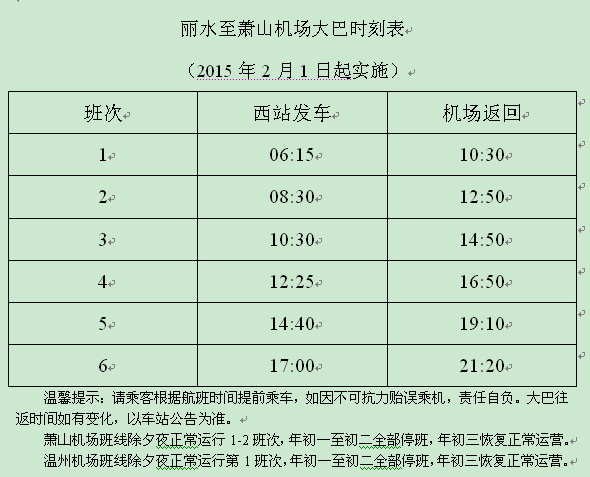 为更加方便市民出行需要,从2月1日起,丽水到萧山机场的客运班车从原来的4个班次增加到6个班次。每天的6:15、8:30、10:30、12:25、14:40、17:00从客运西站发车,萧山机场则在每天的10:30、12:50、14:50、16:50、19:10和21:20返回。需要到萧山机场的乘客只要在客运西站售票窗口、银联卡自助售票机或现金自助售票机上买票上车即可。